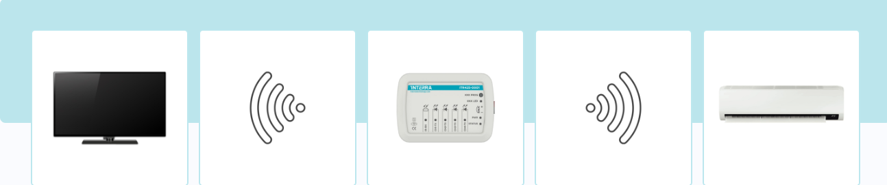 Interra KNX-IR Gatweway — многофункциональный передатчик ИК-сигнала. Он позволяет управлять всеми инфракрасными электронными устройствами, такими как телевизор, DVD, кондиционер. Всего существует пять различных режимов: одиночный режим, режим повторения, последовательный режим, климат-контроль и измерение тока. Interra IR Transmitter имеет максимум 150 универсальных ИК-кодов и 81 AC IR-код. Он имеет 4 интерфейса расширения: A, B, C, D. Interra IR Gateway производится в соответствии со стандартом ЕС с точки зрения совместимости по ЭМС и электробезопасности.